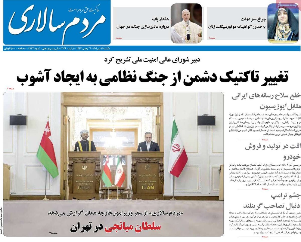 مطبوعات ۲۱ دی ۱۴۰۴ - ۰۸:۴۳ کد مطلب: 144078 دریافت تصاویر صفحه اول روزنامههای یکشنبه ۲۱ دیماه ۱۴۰۴ برچسبها مطبوعات